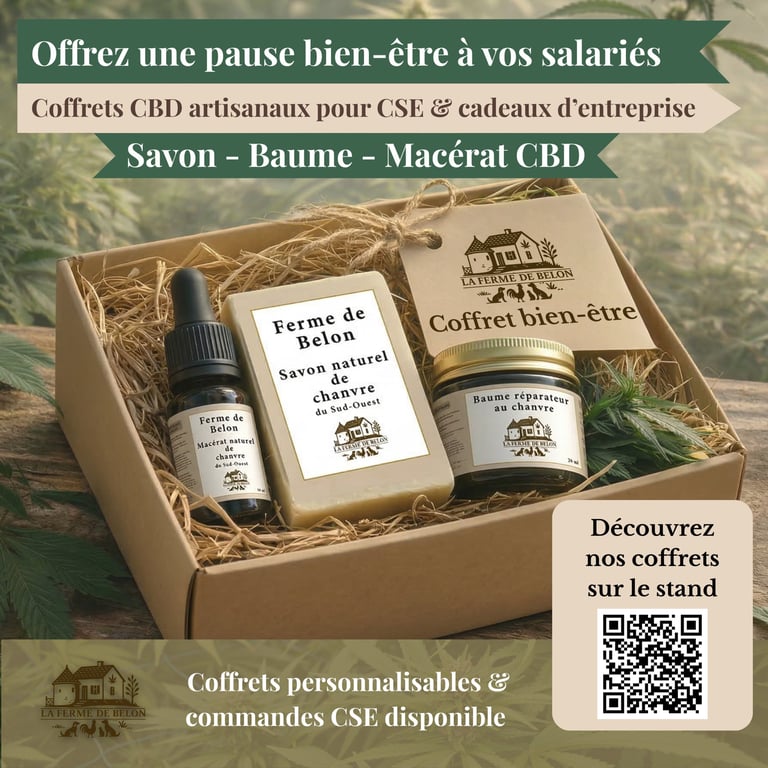 Pensé pour les CSE et les cadeaux d’entreprise, ce coffret artisanal permet de faire découvrir notre univers à travers une sélection de produits naturels au chanvre, fabriqués avec soin à la ferme.